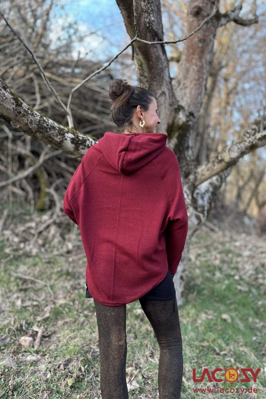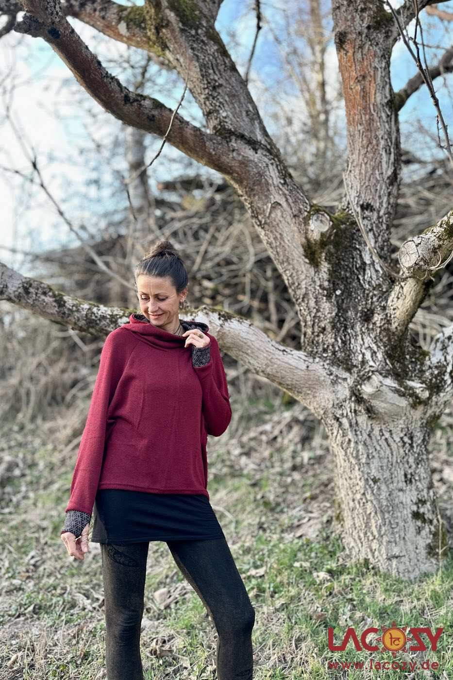 Hoodie AYDI ist die Schwester von Hoodie AYRI und bietet statt einer offen geschnittenen, weite Kapuze (Modell AYRI) eine Kapuze im Schalkragen Design.
