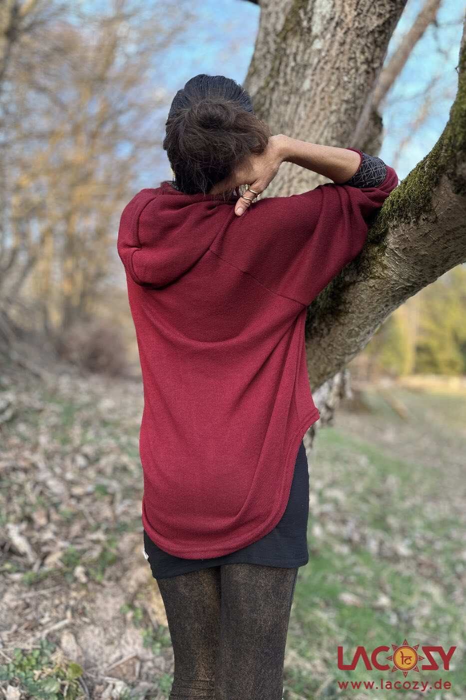 Der lässige Schnitt mit Fledermausärmeln, Schalkapuze, Daumenlöchern und der hinten etwas länger geschnittenen Form sorgt für eine entspannte Silhouette und hohen Tragekomfort. Durch die längere Rückenpartie wird der Po leicht kaschiert.