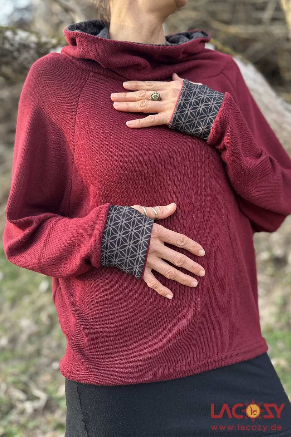 Lässiger Yoga Hoodie AYDI aus weicher Baumwolle mit Fledermausärmeln, Schalkapuze und Blume des Lebens Print. Perfekt für Yoga, Alltag und entspannte Layering Looks.