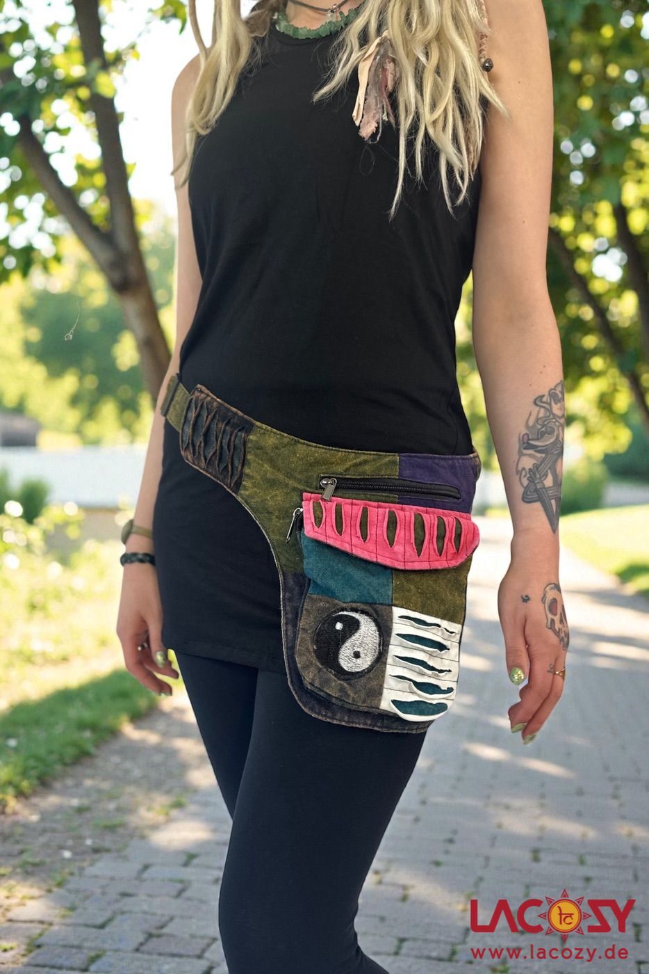 Bunte Patchwork Gürteltasche im Hippie Style. Handgemachtes Unikat aus Baumwolle mit Yin Yang Symbol – praktisch für Festival, Reisen & Alltag.