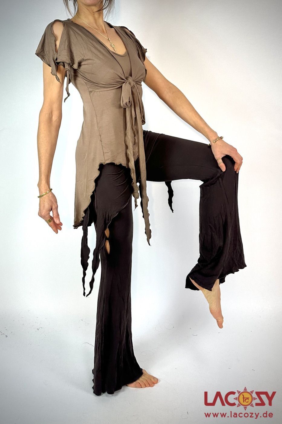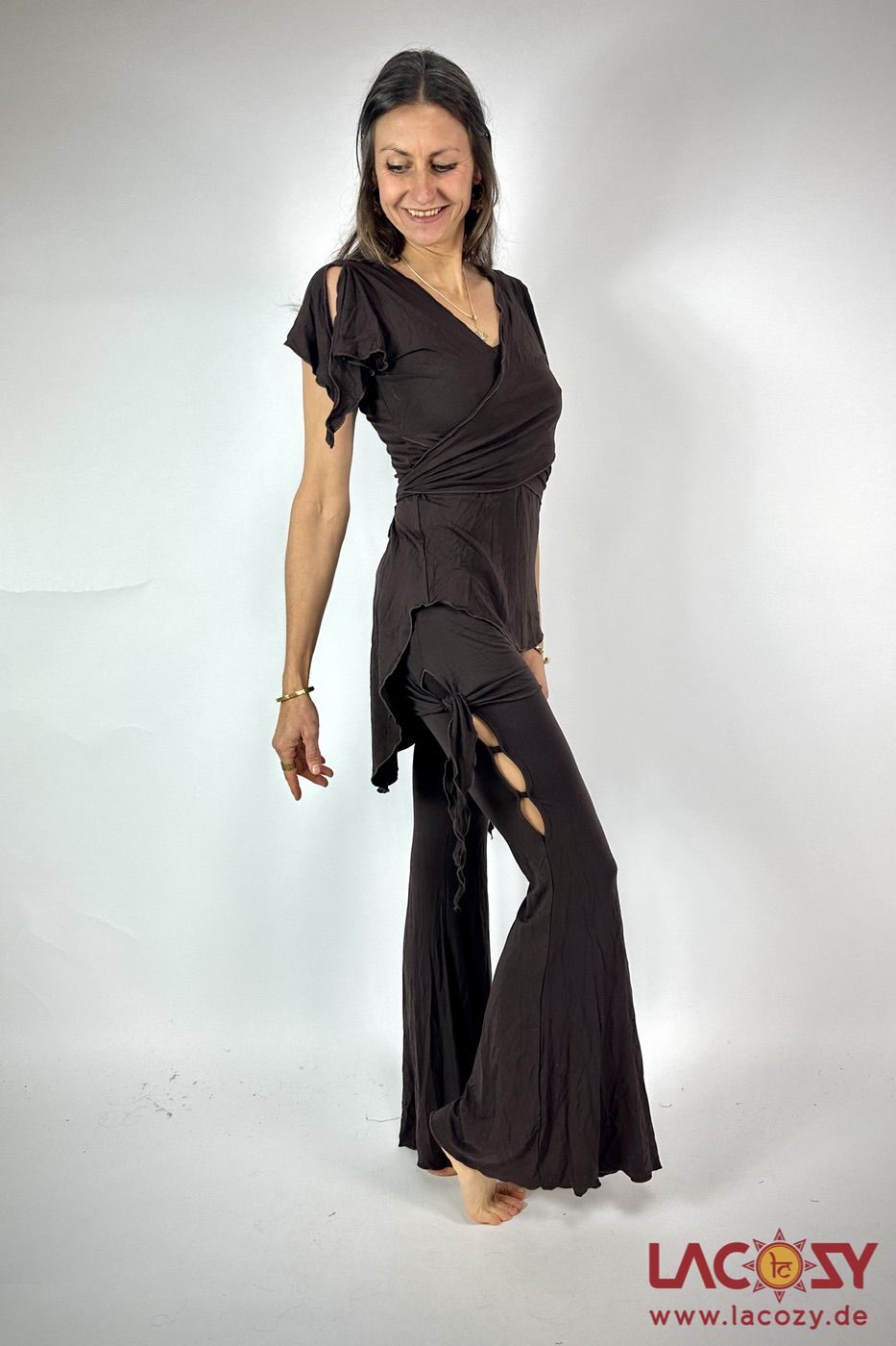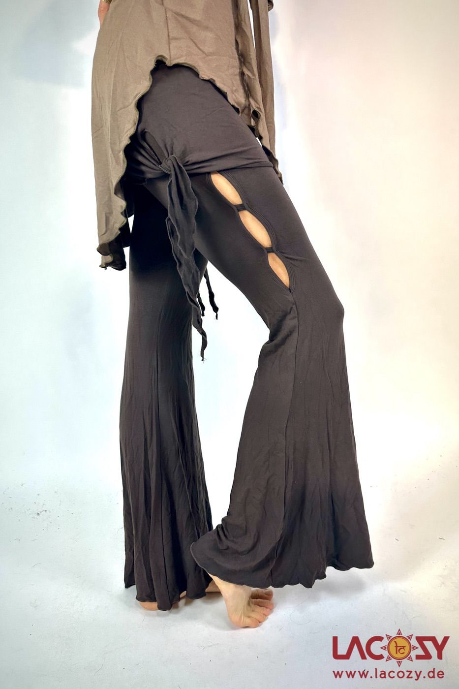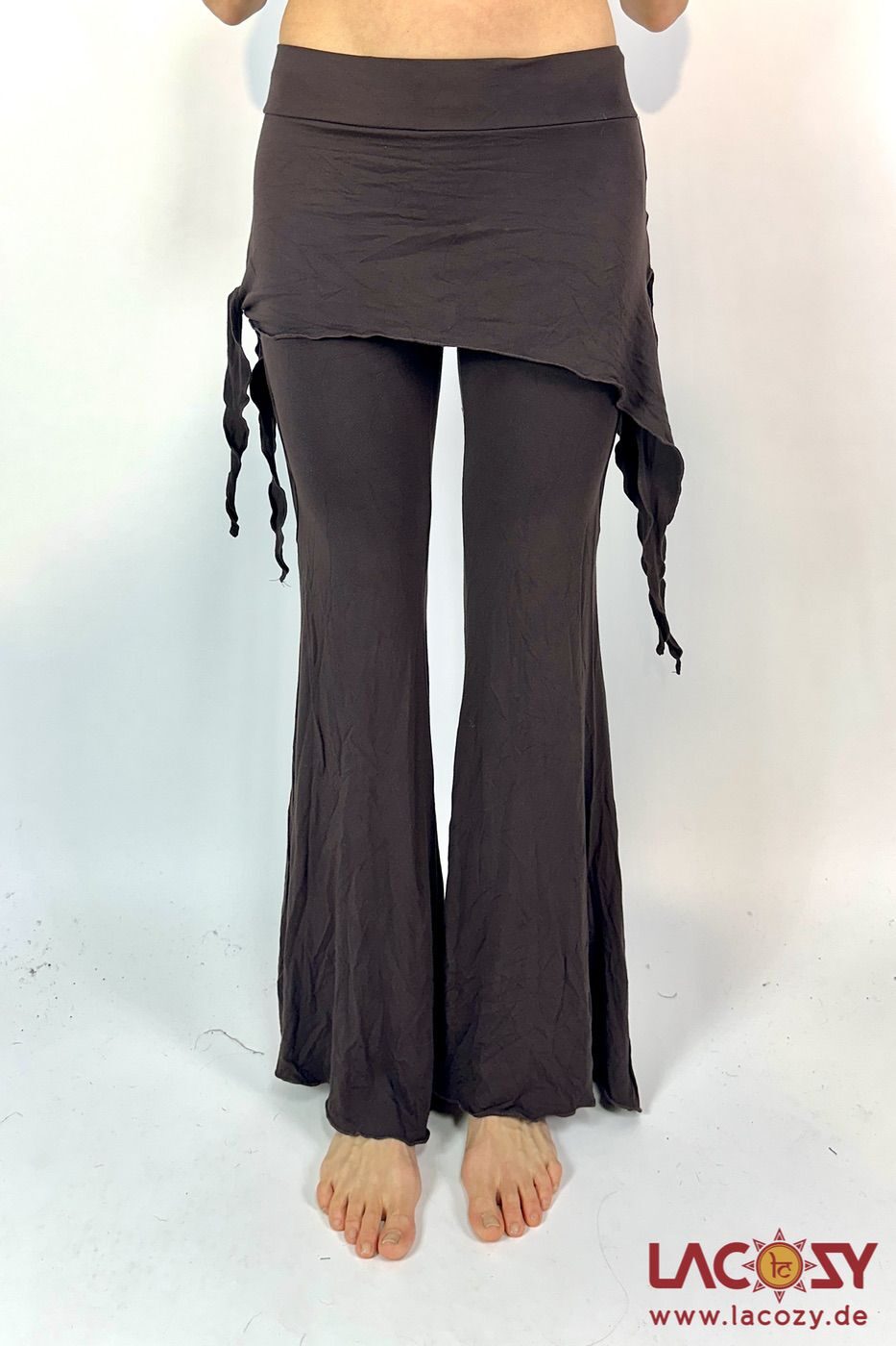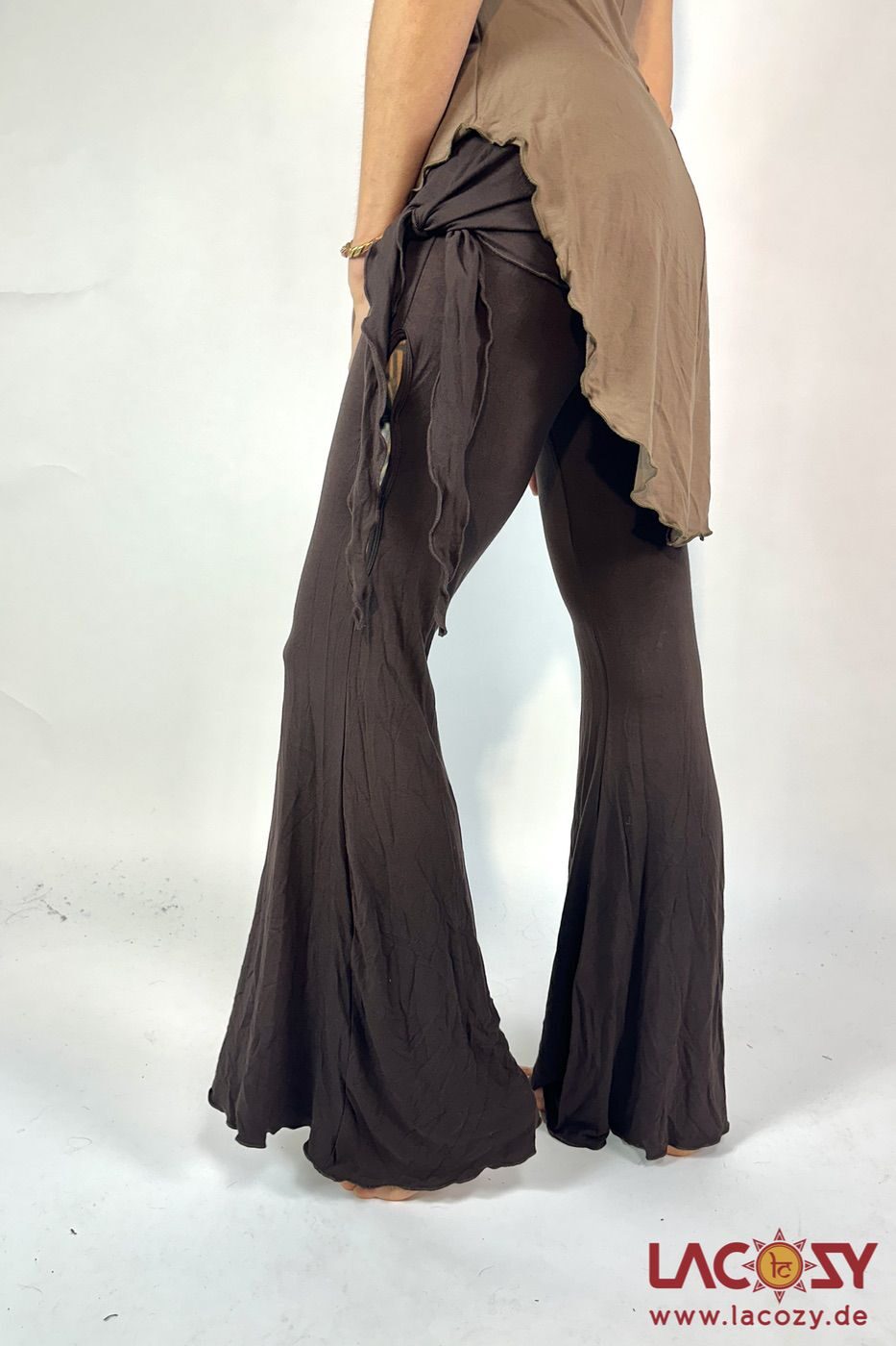 Braune high waist Schlaghose LUNARA mit asymmetrischem Rock und sexy Beinschlitz. Super weich & stretchy – perfekt für Festival, Yoga & Tanz.