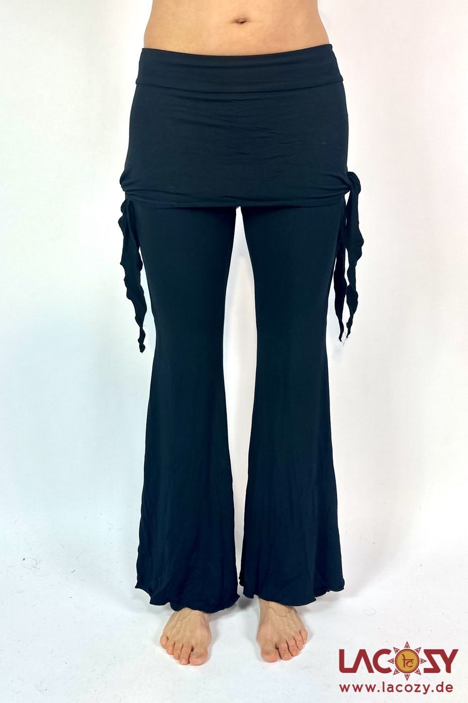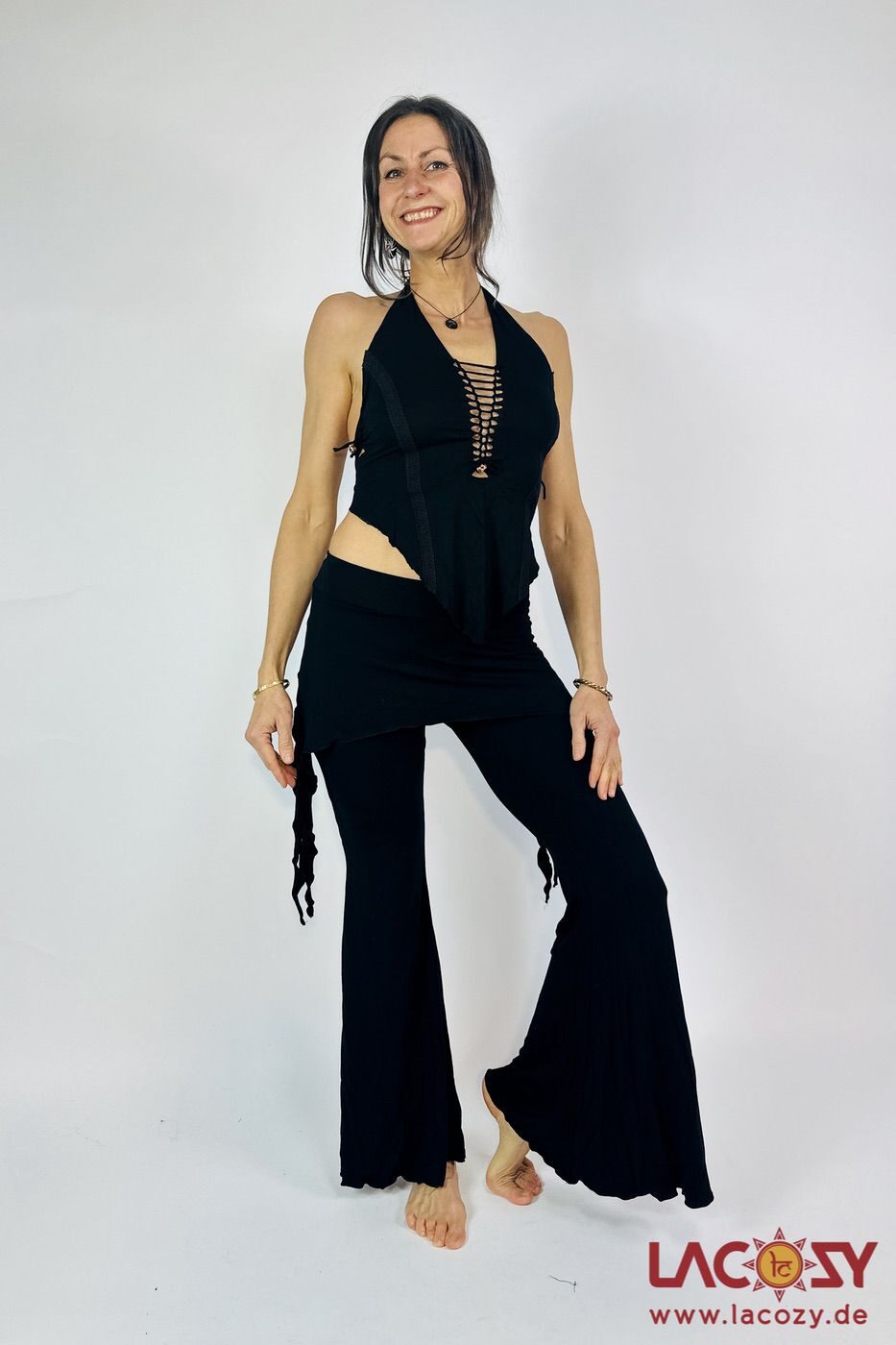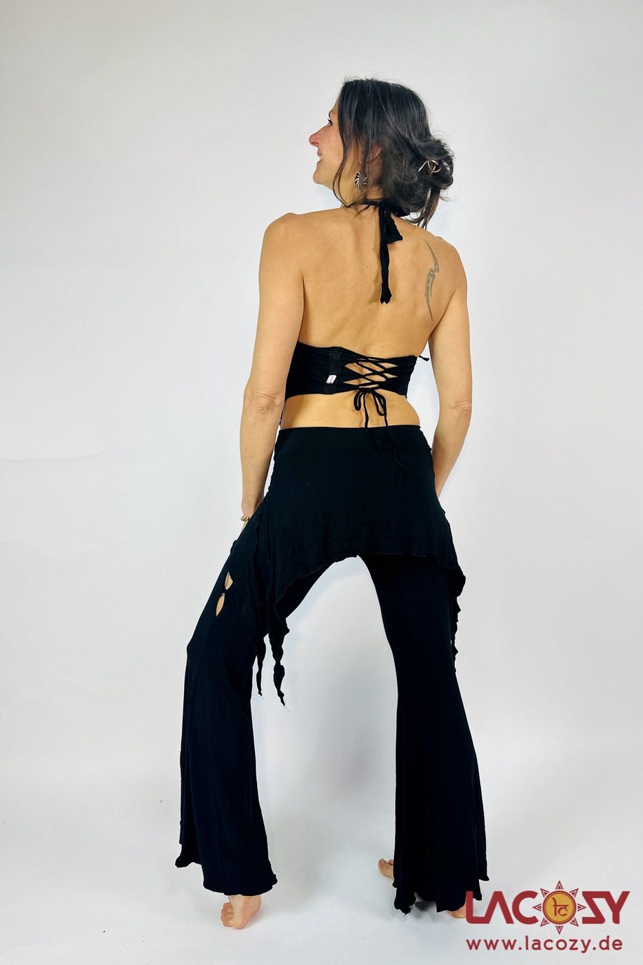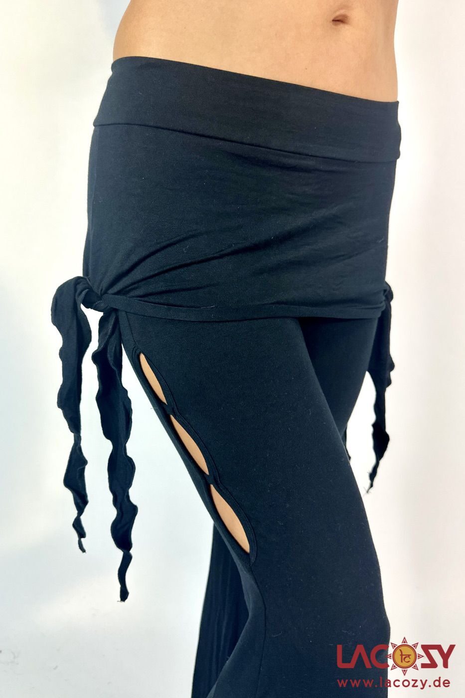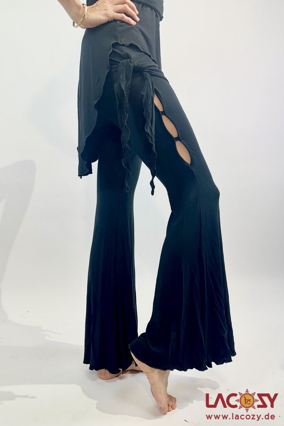 Schwarze high waist Schlaghose LUNARA mit asymmetrischem Rock und sexy Beinschlitz. Super weich & stretchy – perfekt für Festival, Yoga & Tanz.