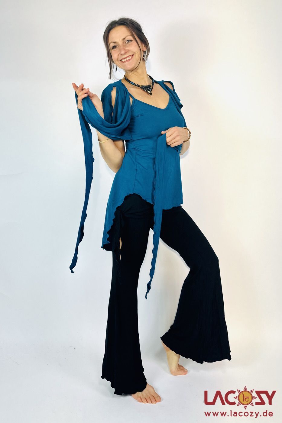 * Info: Unser Model ist 1,72 m groß, trägt normal Größe 36 und kombiniert hier das schwarze Top ALYA sowie das petrolfarbene Zipfelshirt LUNERI