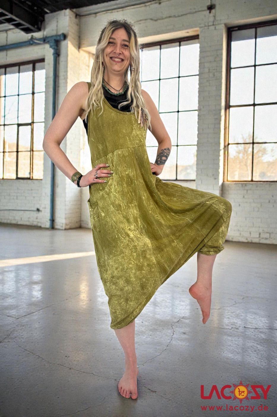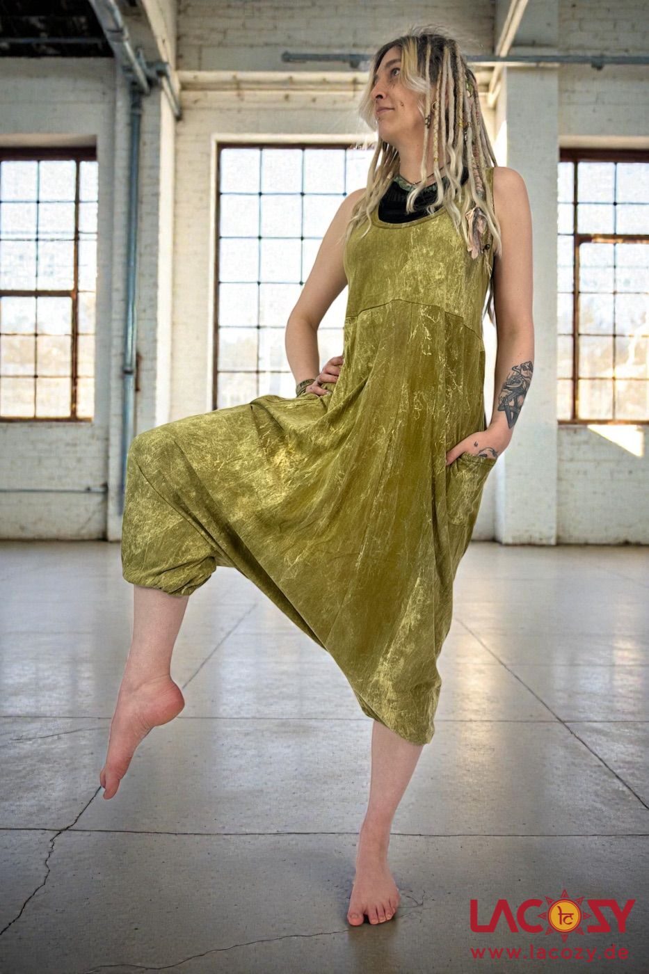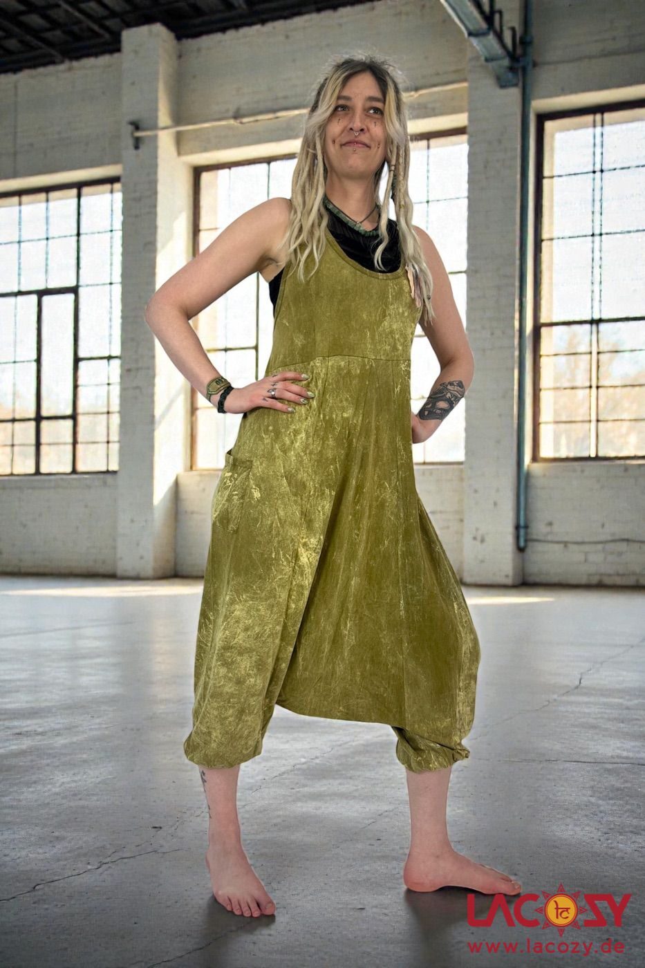 Gemütlicher Haremsstyle Overall mit praktischen Taschen in grünlichem Stonewash Design.