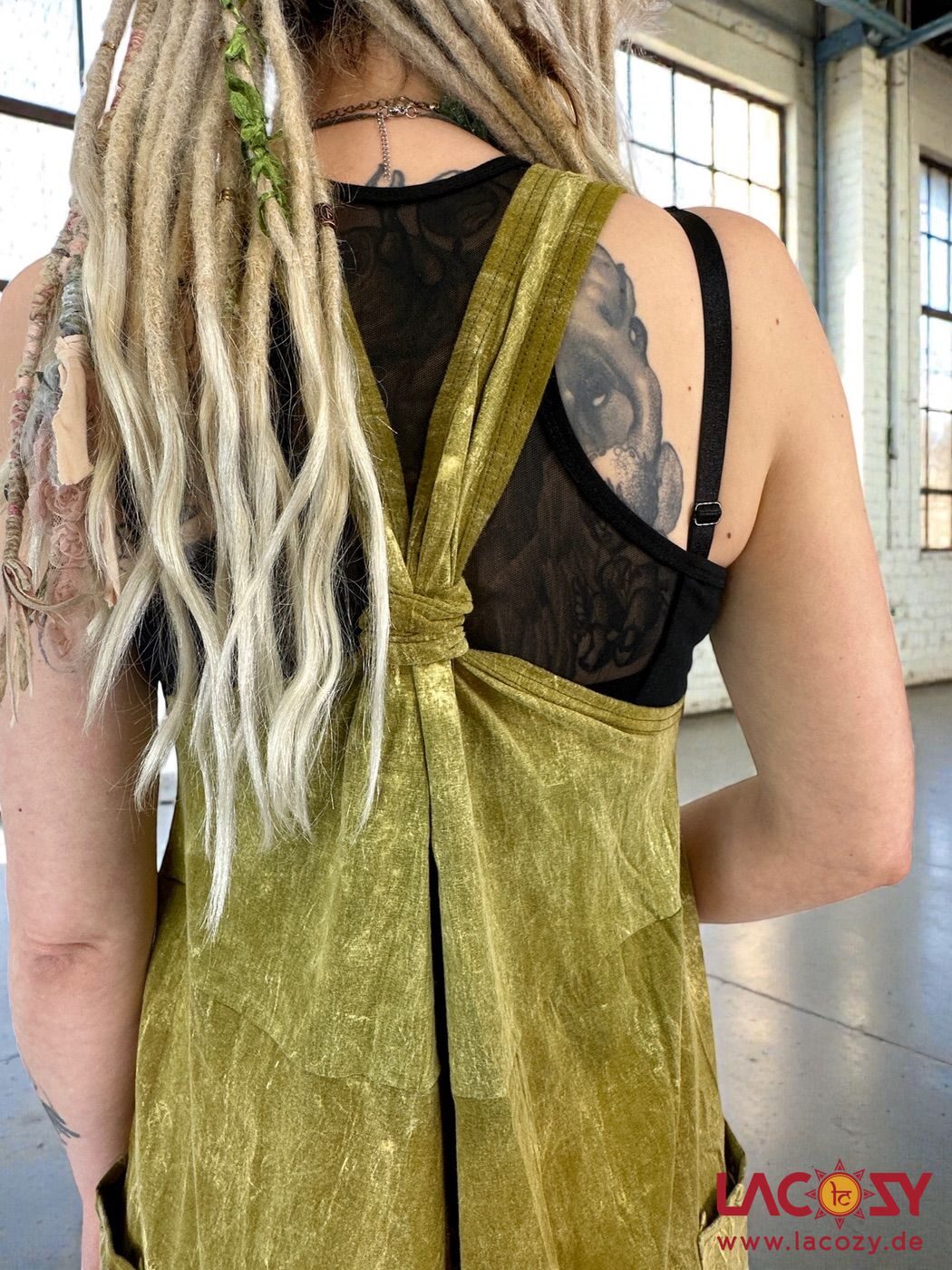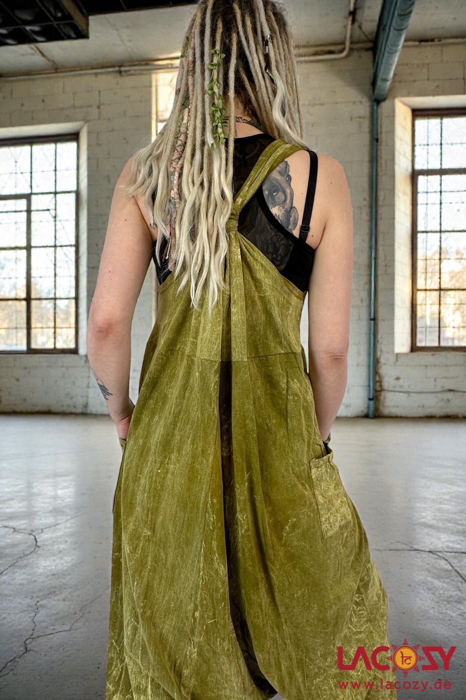 Die breiten Träger können mit dem Schiebeknoten hinten perfekt angepasst werden. Das robuste und dennoch weiche, geschmeidige Material macht den Jumpsuit im Baggy Look nicht nur zum luftigen Begleiter im Sommer. Mit Pulli oder Longsleeve darunter und Stiefeln kombiniert ist er auch perfekt für kühlere Temperaturen geeignet.