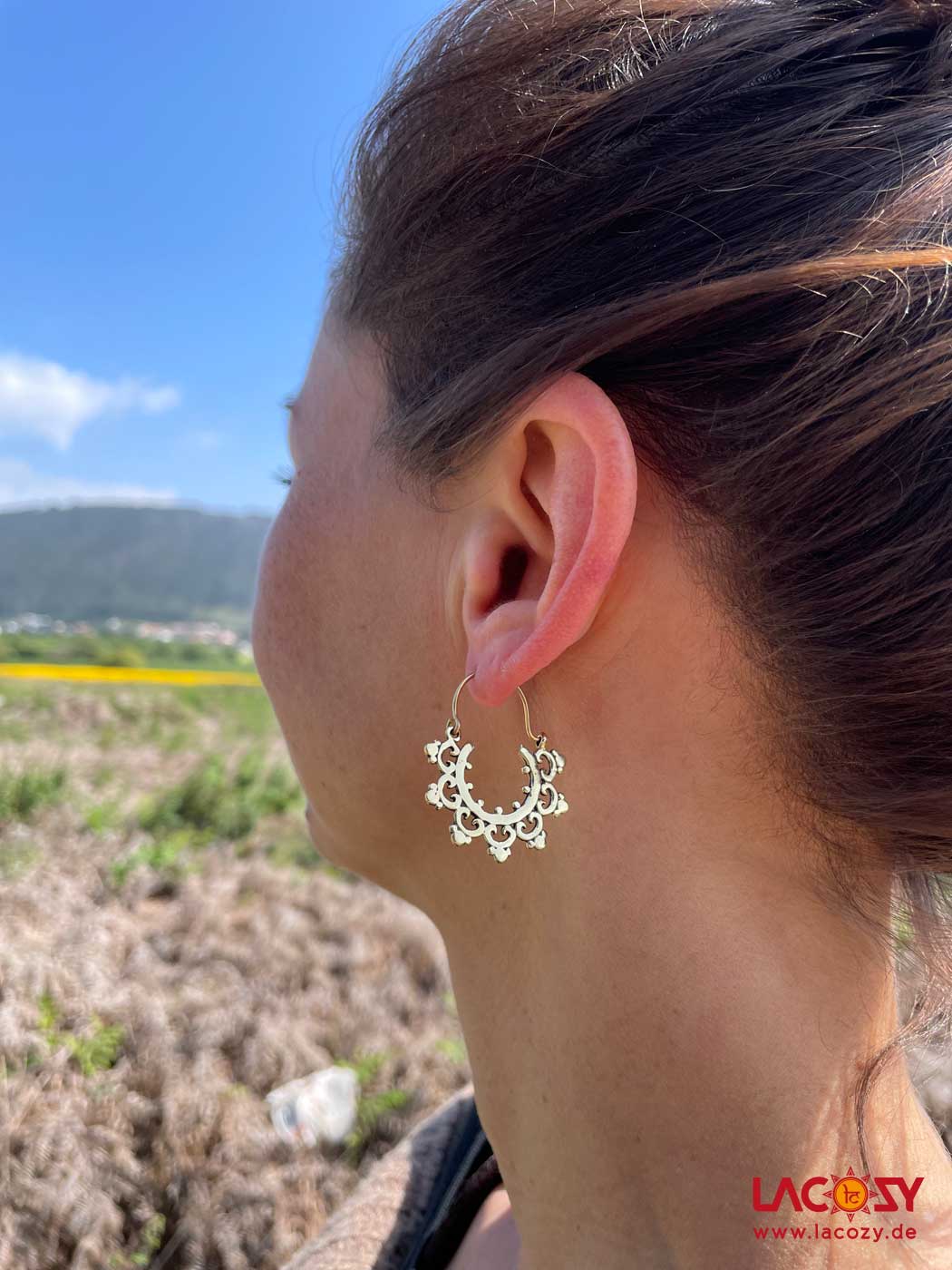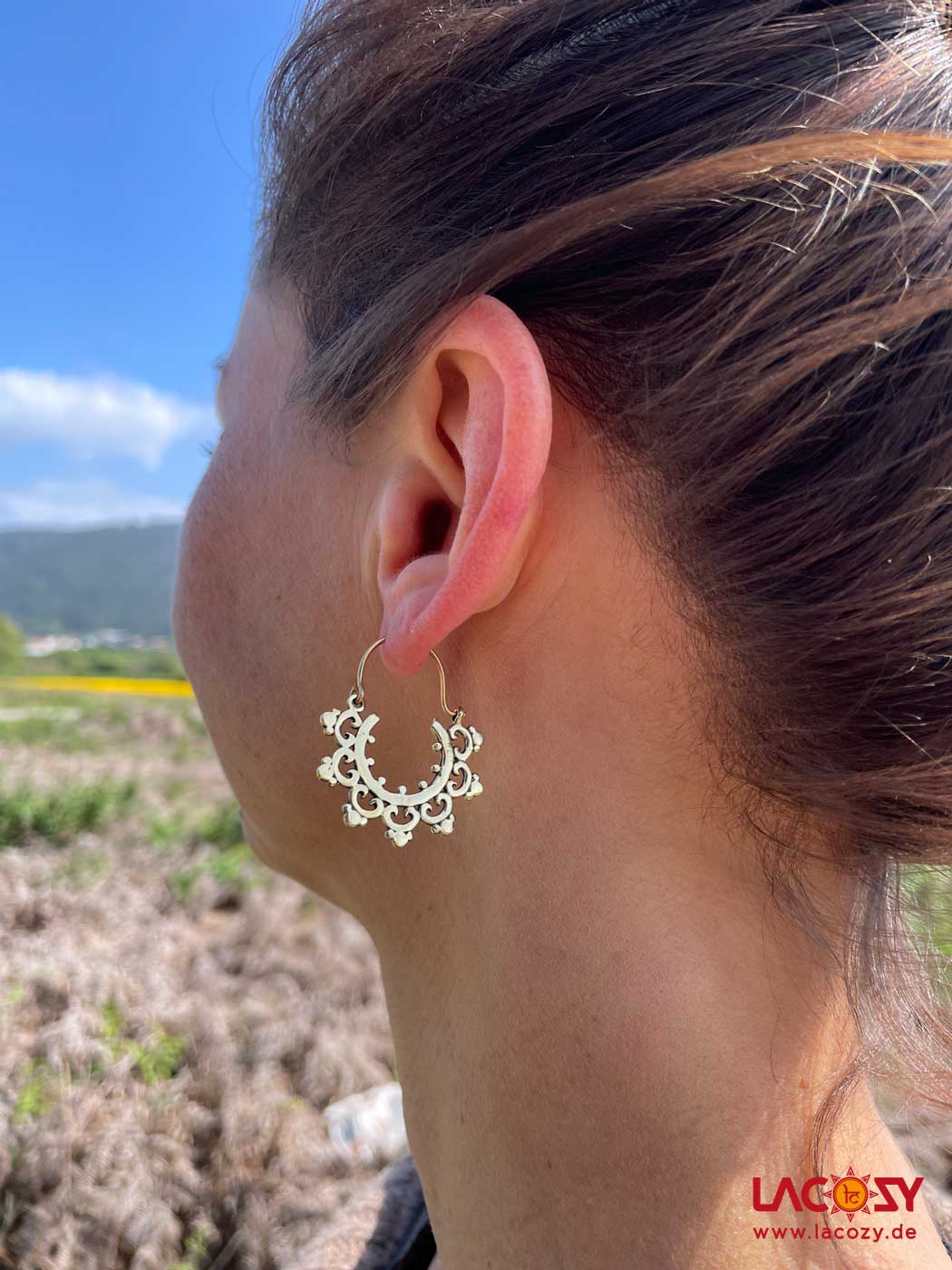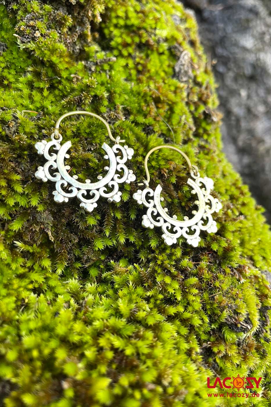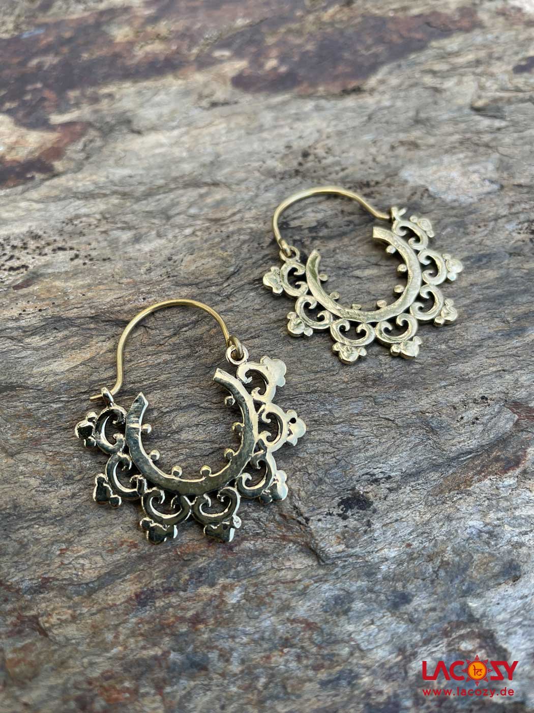 Wunderschön detailreich gearbeitete Messing Creolen mit verschnörkelten Ornamenten.