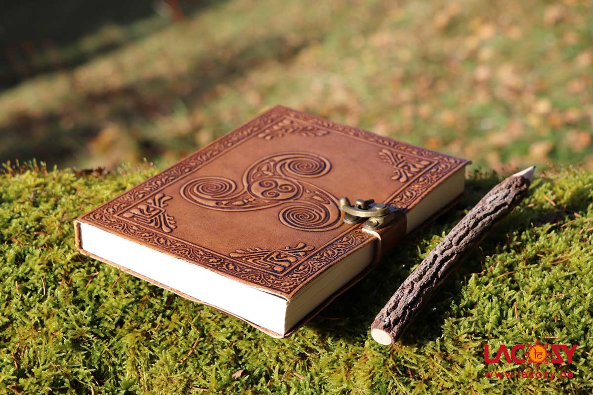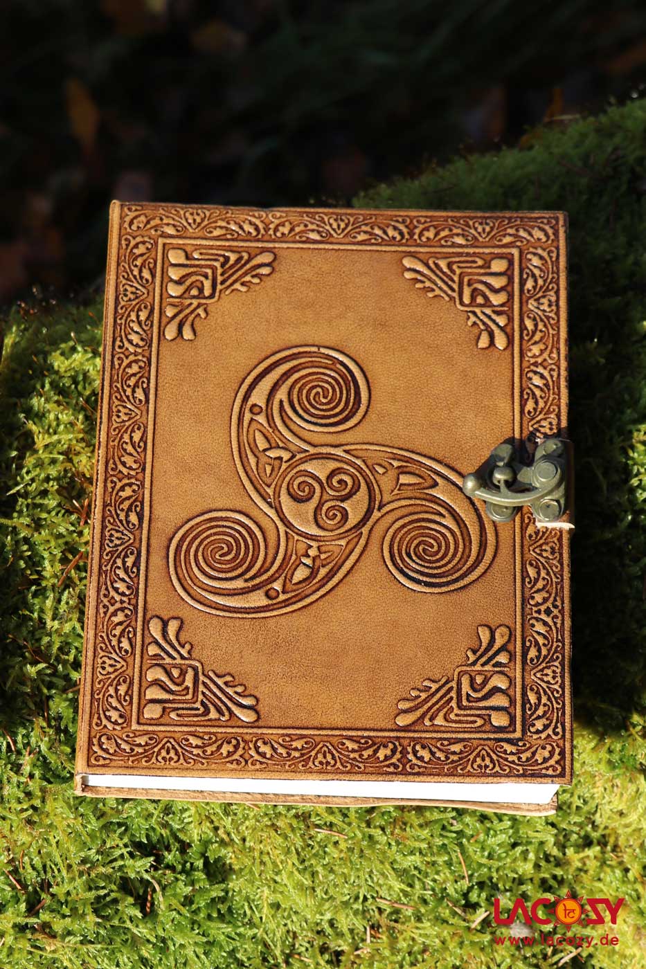 Dieses feine Lederbuch mit dem mystischen Symbol der Triskele ist mit seiner detailreichen Prägung auf Vorder- und Rückseite eine Wonne für jeden, der gerne schreibt, dichtet, zeichnet oder skizziert. Der ideale Wegbegleiter, um Gedanken, Wünsche oder Ideen zu verewigen.