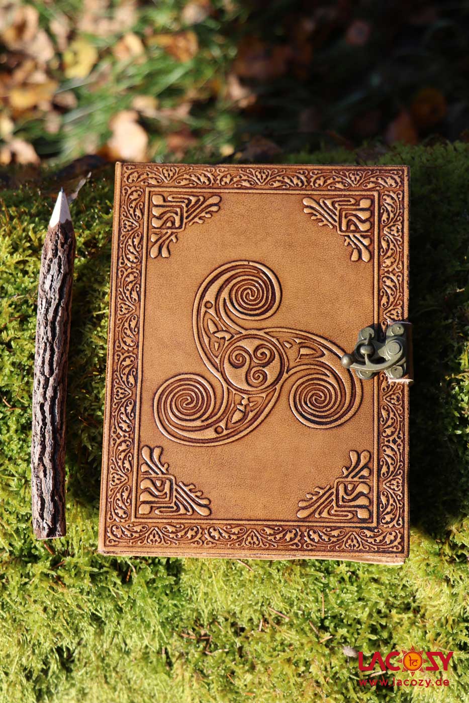 Notizbuch aus Leder mit großer Triskele und glattem Skizzenpapier.