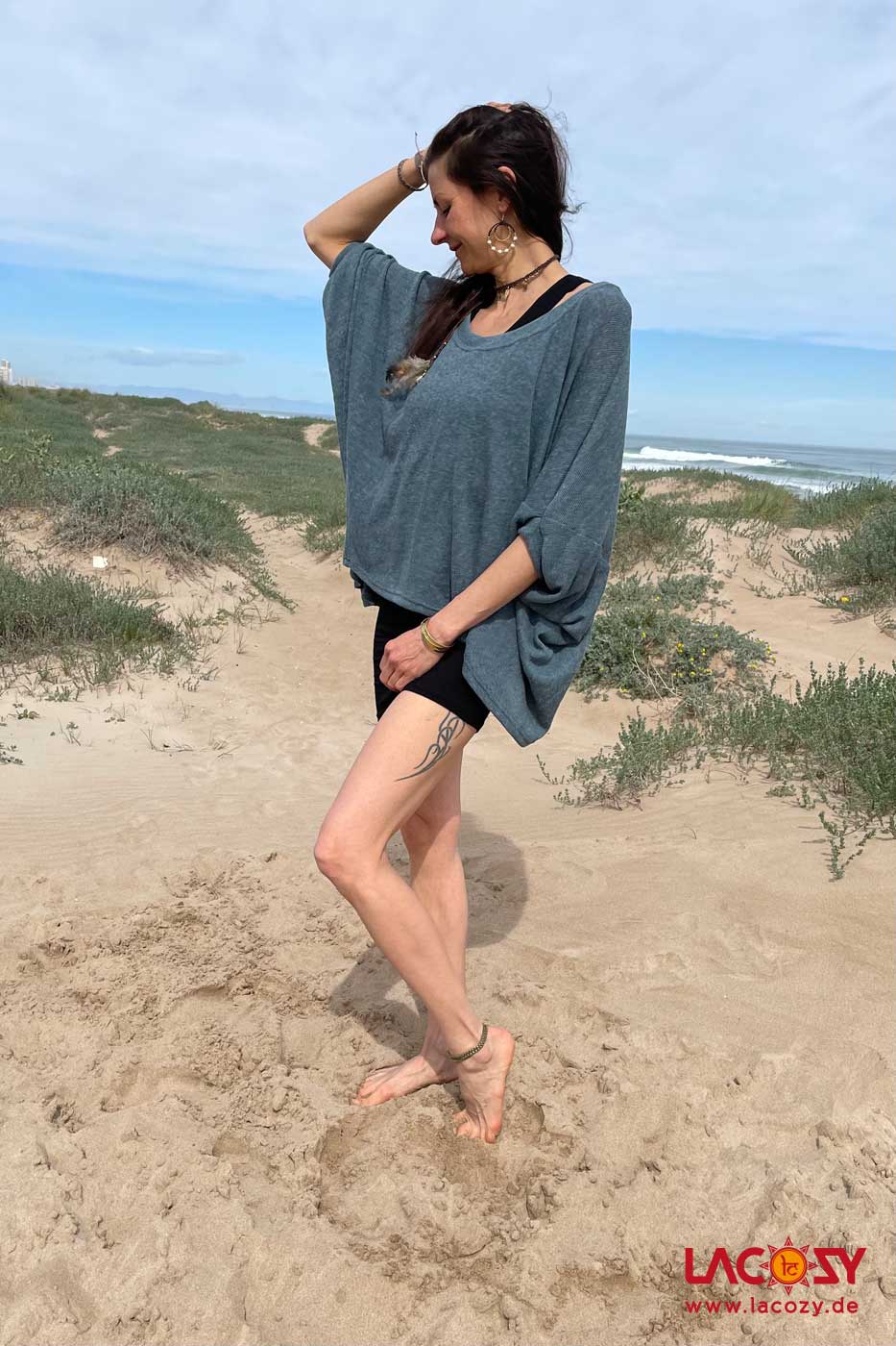 Locker fallender Oversize Pullover aus elastischer Baumwolle in Petrol. Weit geschnitten, weich & luftig – perfekt für Boho- Lagenlook und Alltag.