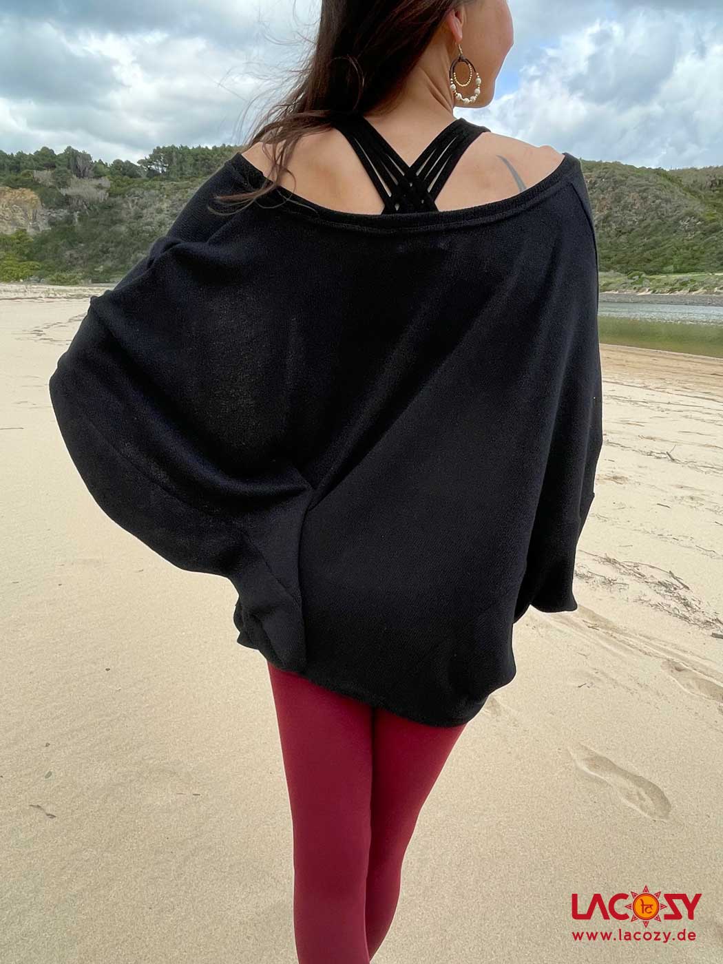 Locker fallender Oversize Pulli aus elastischer Baumwolle in Schwarz. Weit geschnitten, weich & luftig – perfekt für Boho- Lagenlook und Alltag.