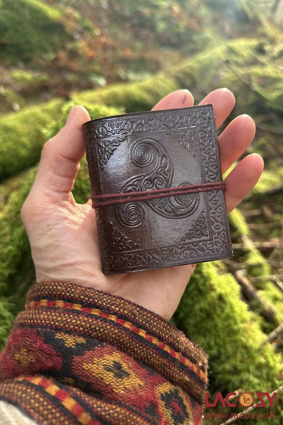 Praktisches kleines Lederbuch im Miniformat mit mystischem Motiv der Triskele – ein uraltes keltisches Symbol für Wandel, Wachstum und die Harmonie der Elemente.