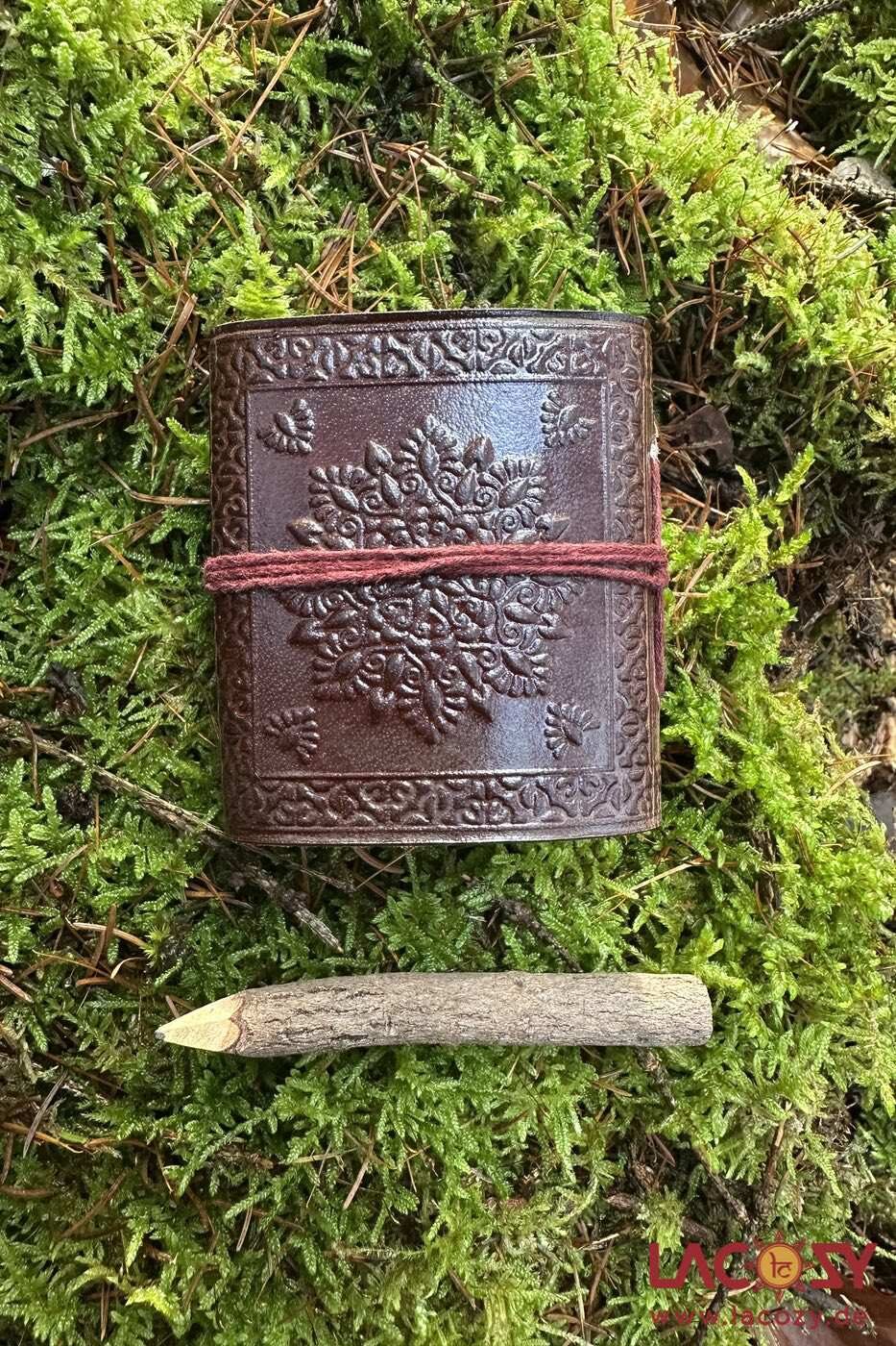 Kleines handgeprägtes Mini-Lederbuch mit Triskele Symbol und passendem Ast-Stift. Perfekt für Notizen, Wünsche, Rituale & unterwegs.