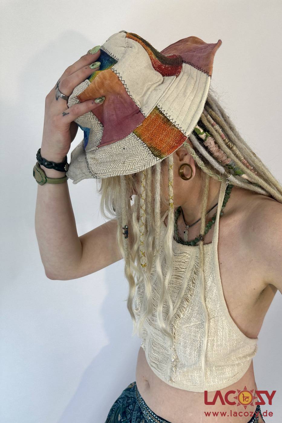 Handgefertigter Patchwork Hanf Fischerhut mit formbarer Krempe. Nachhaltig, bequem & ideal für Sommer, Festivals und Alltag.