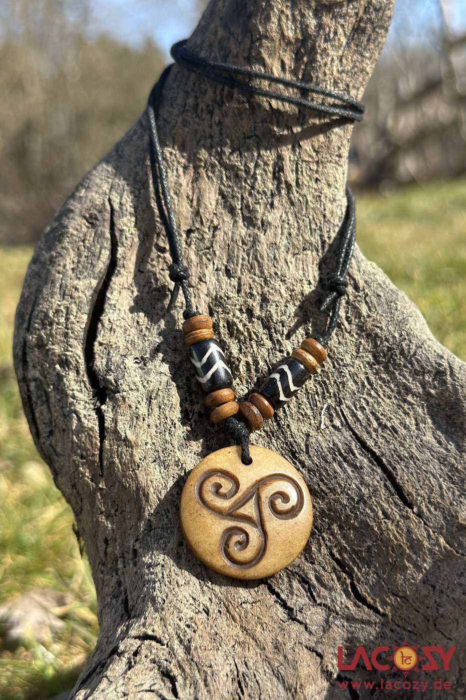 Handgefertigte Triskele Kette aus Yak-Knochen mit kunstvoll graviertem Symbol der Triskele.