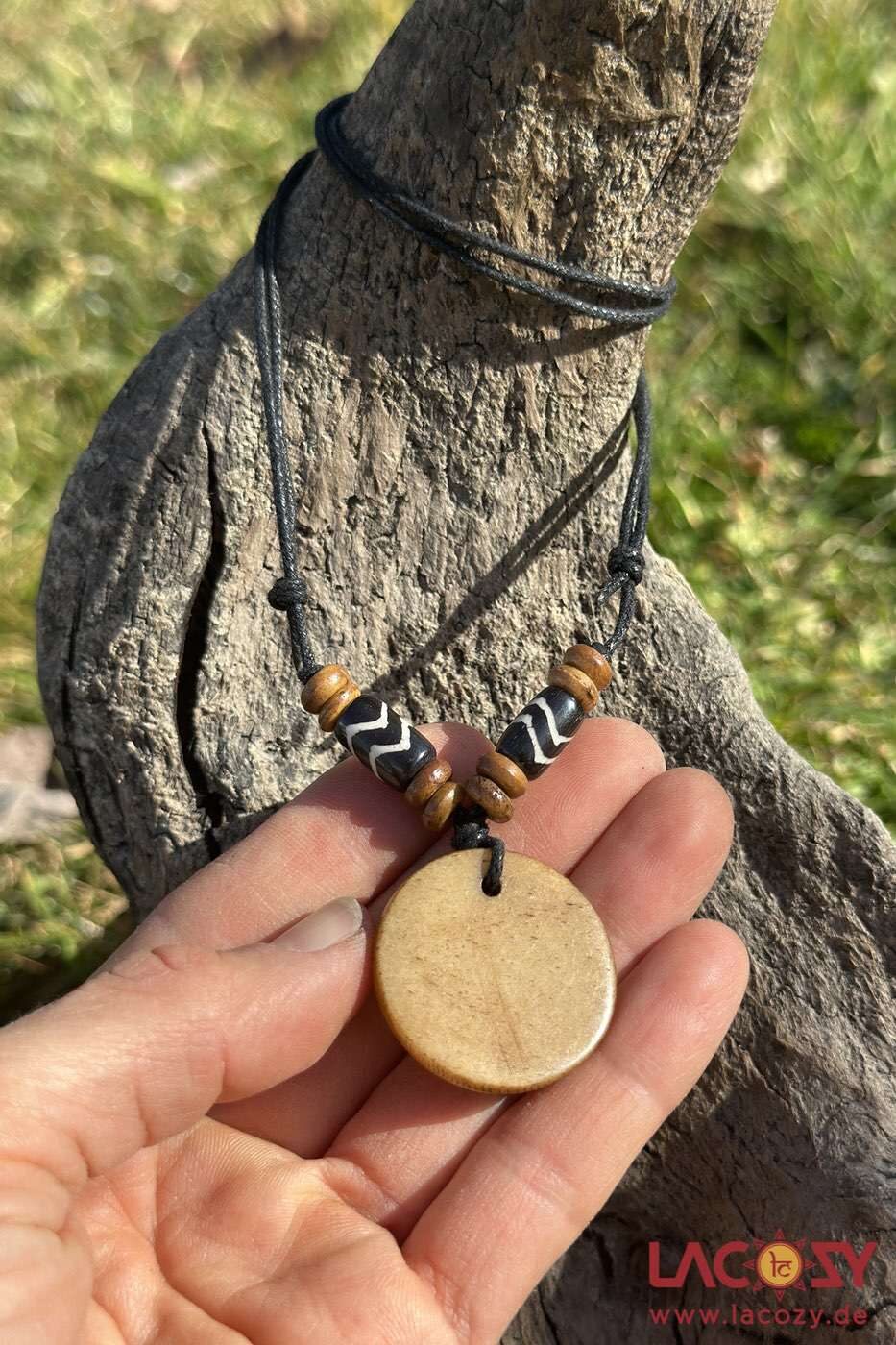 Der Anhänger wird aus Knochen gefertigt, die von Tieren stammen, die eines natürlichen Todes gestorben sind. In der buddhistischen und hinduistischen Kultur wird der Kreislauf des Lebens geehrt, weshalb möglichst jeder Teil des Tieres weiterverwendet wird – so entstehen handgefertigte Schmuckstücke mit Respekt vor Natur und Leben.