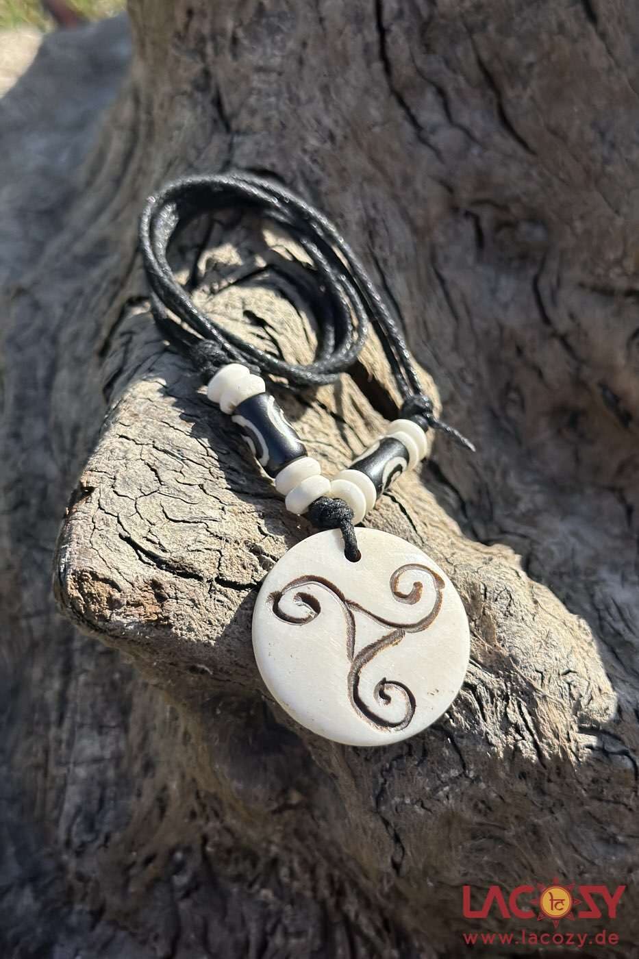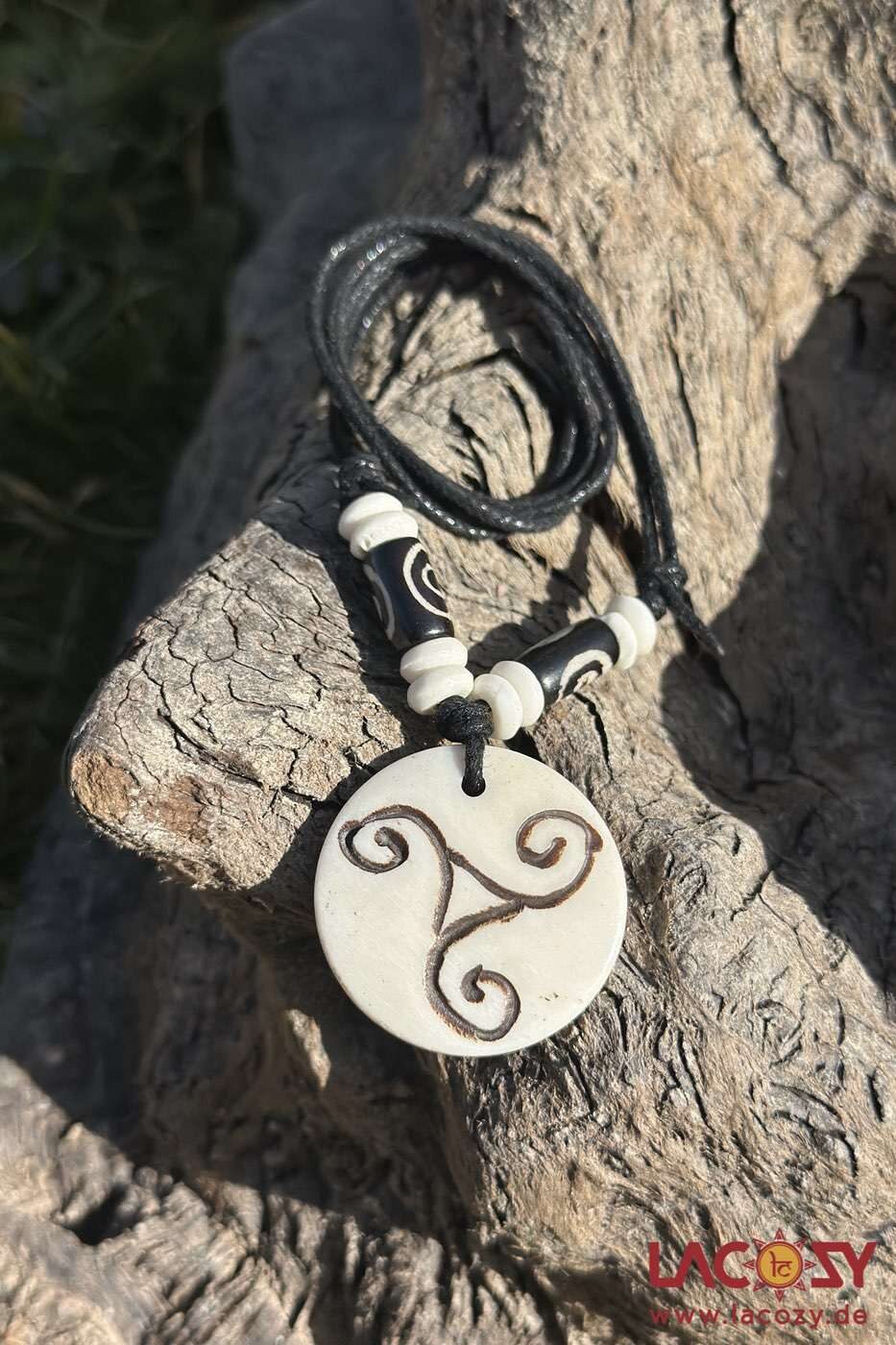 Handgefertigte Triskele Kette aus Yak-Knochen mit kunstvoll graviertem Symbol der Triskele.