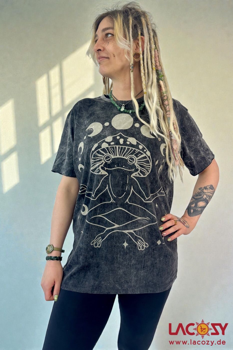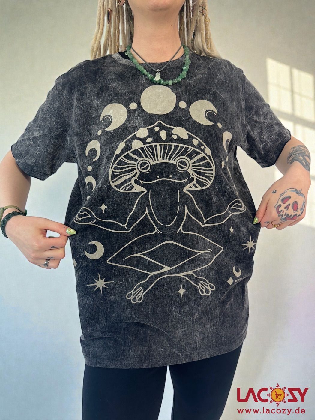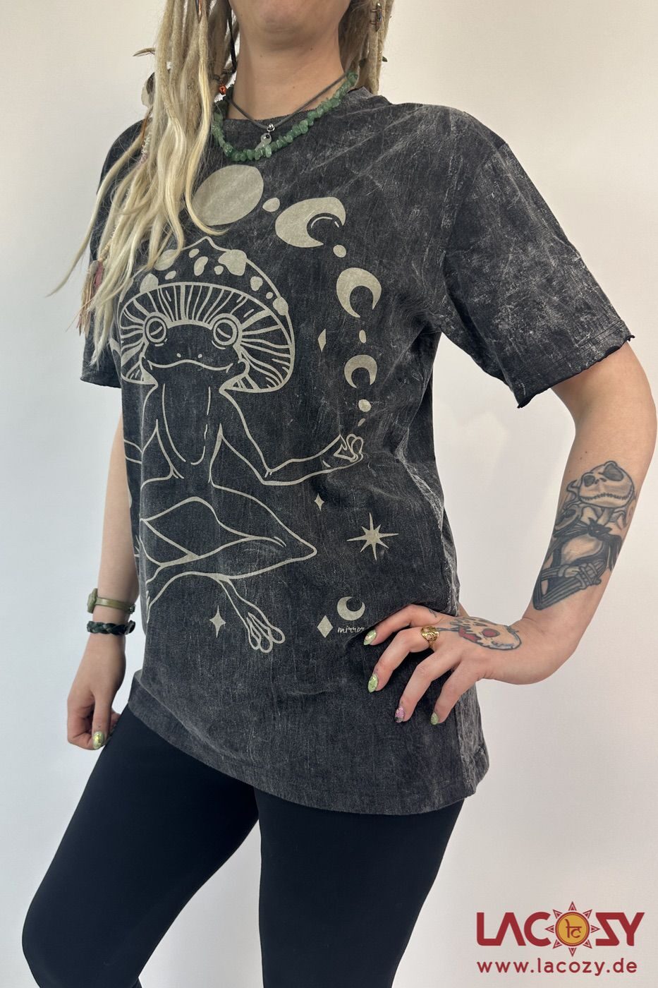 Unisex Mirror T-Shirt aus 100 % Baumwolle im Stonewash Look. Mystisches Design mit Frosch- und Pilzmotiv, Mond & Sternen – bequem & einzigartig für Alltag & Festival.